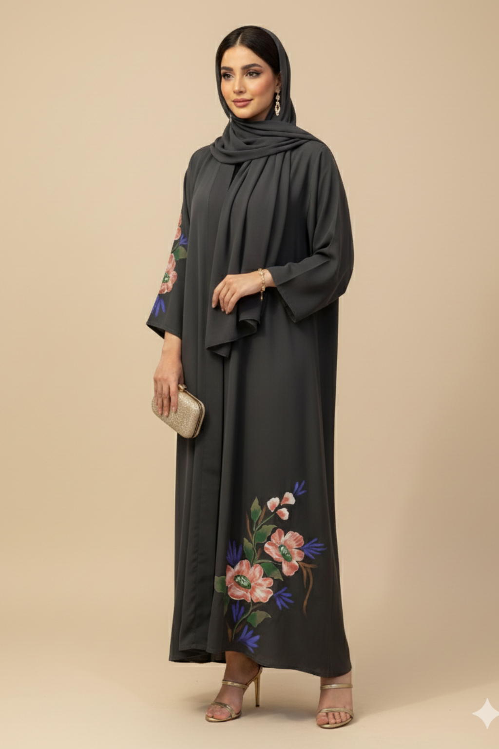 An elegant charcoal abaya featuring hand-painted florals on the sleeve and hem—each piece is slightly unique. Cut with a graceful drape for a refined, modest silhouette.
