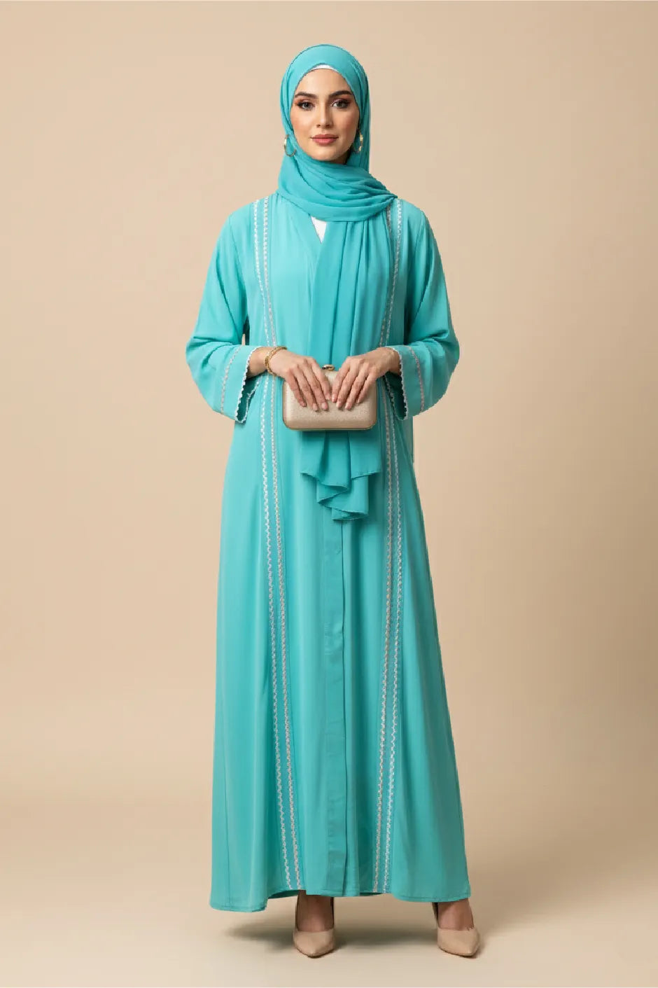 A striking teal abaya defined by vertical zigzag embroidered panels that frame and subtly lengthen the silhouette. Finished with matching embroidered cuffs, a clean V-front, and a breathable, opaque drape—elegant for work, gatherings, and occasions.