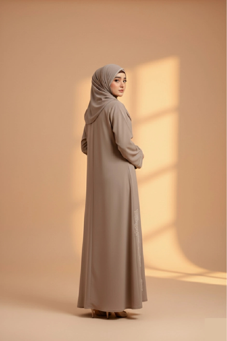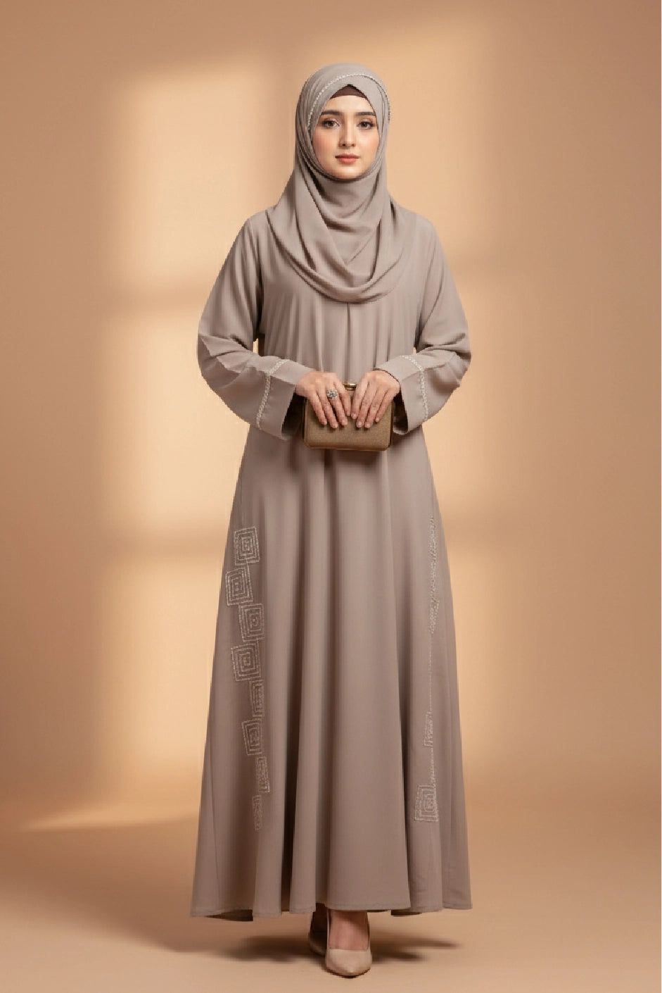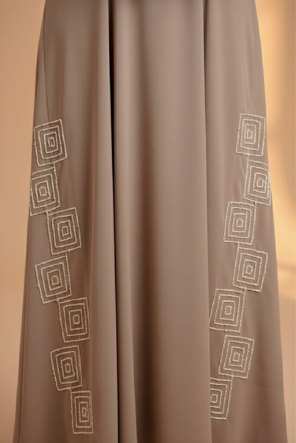 A refined beige abaya detailed with delicate, geometric hand work that runs down both sides, with matching accents on the sleeves and hijab. The fluid drape and clean lines make it effortless for everyday elegance or occasions.