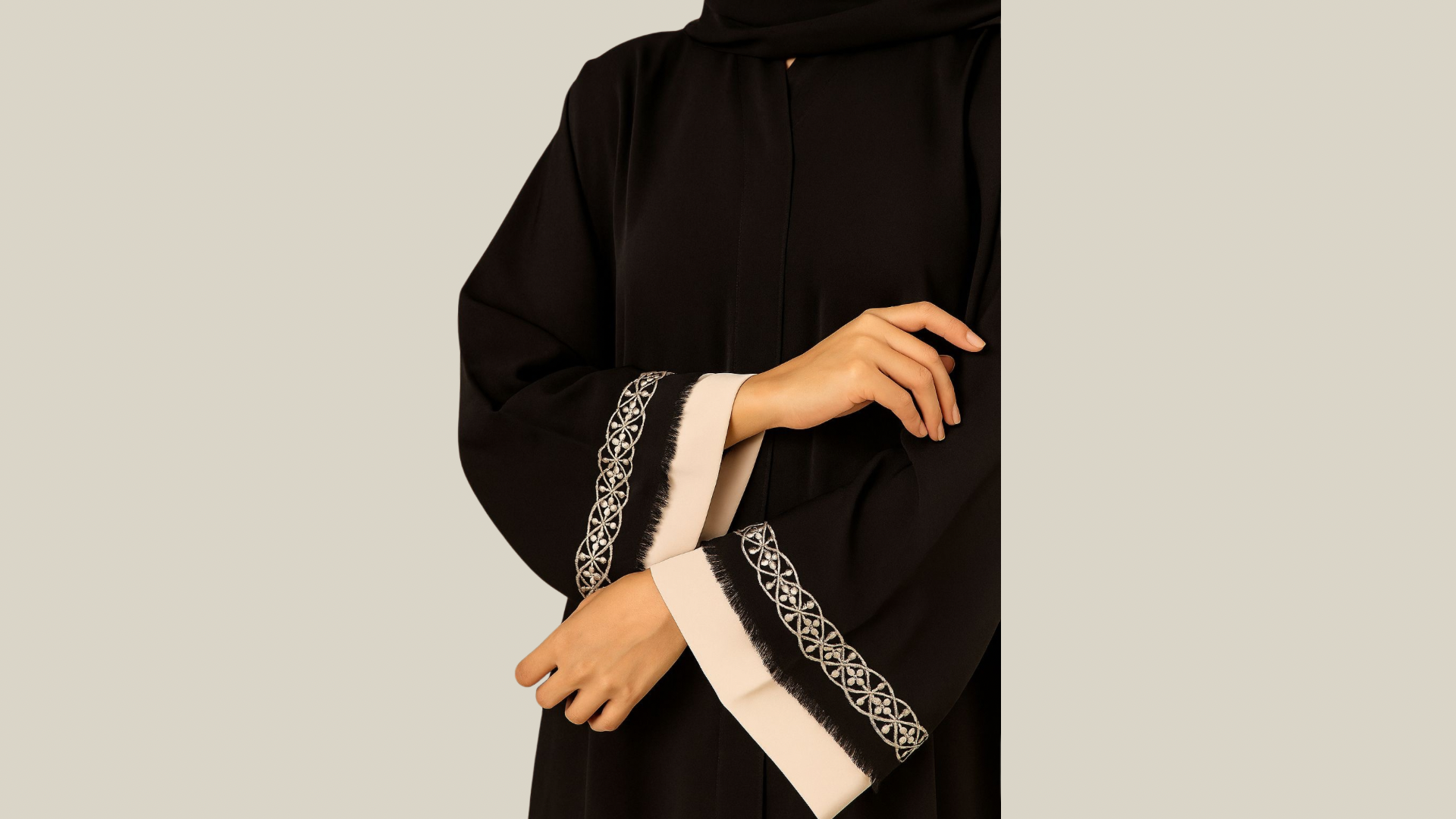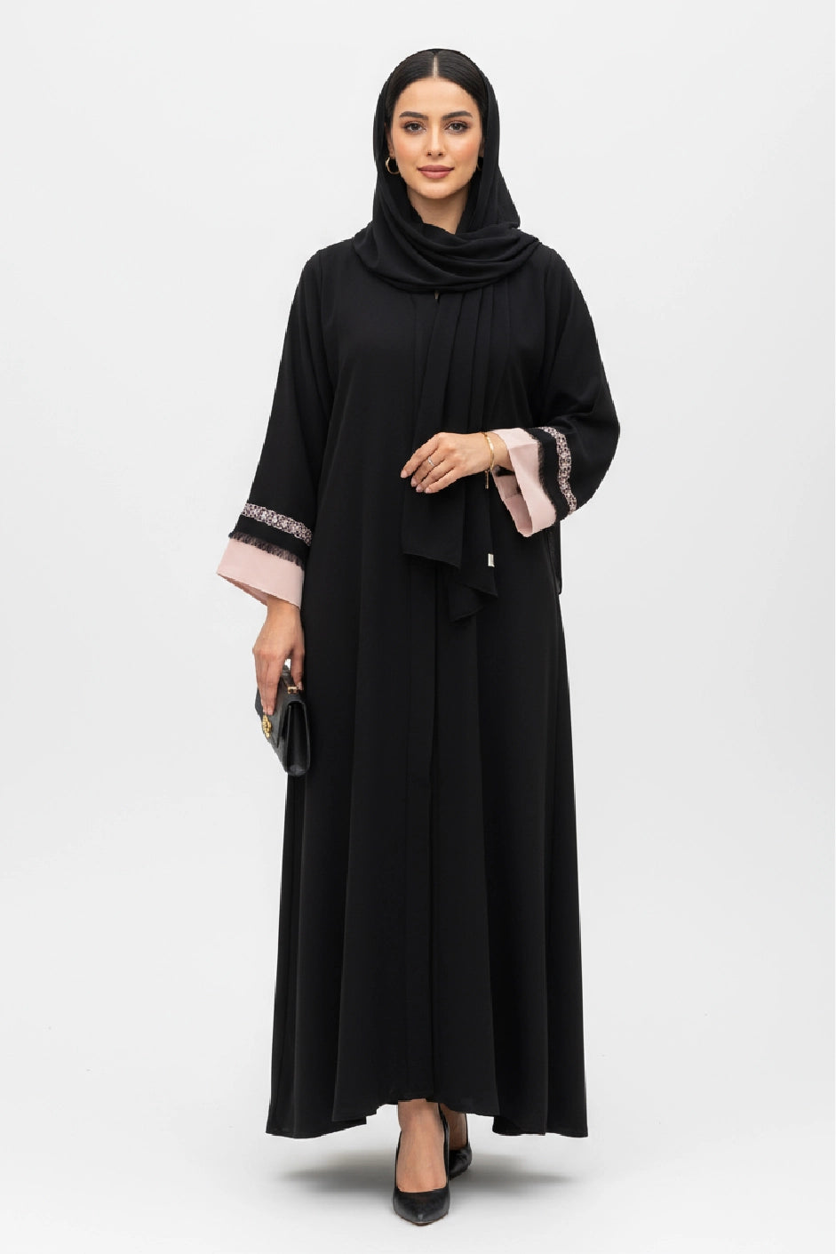 A timeless black abaya elevated with beige satin cuffs and delicate embellished trim.