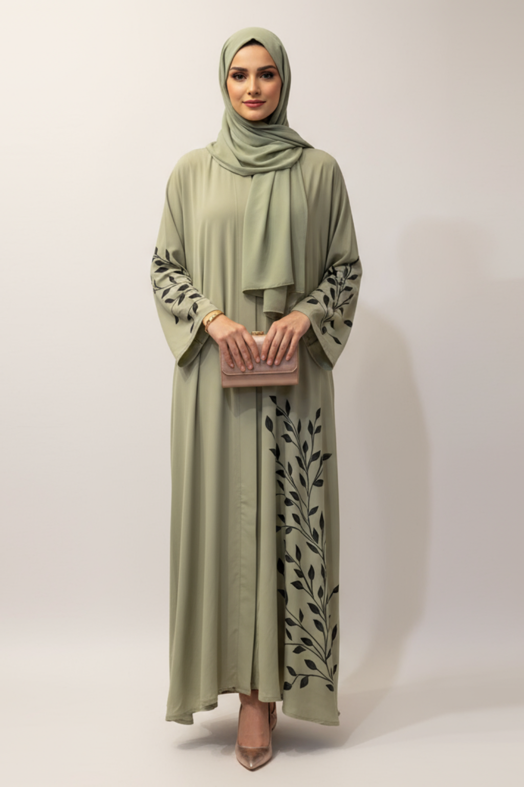 A graceful sage abaya featuring hand-painted black leaf vines flowing across the sleeves and the right side panel. Cut in a relaxed, full-length silhouette with a soft, fluid drape—elegant for every day or occasions.