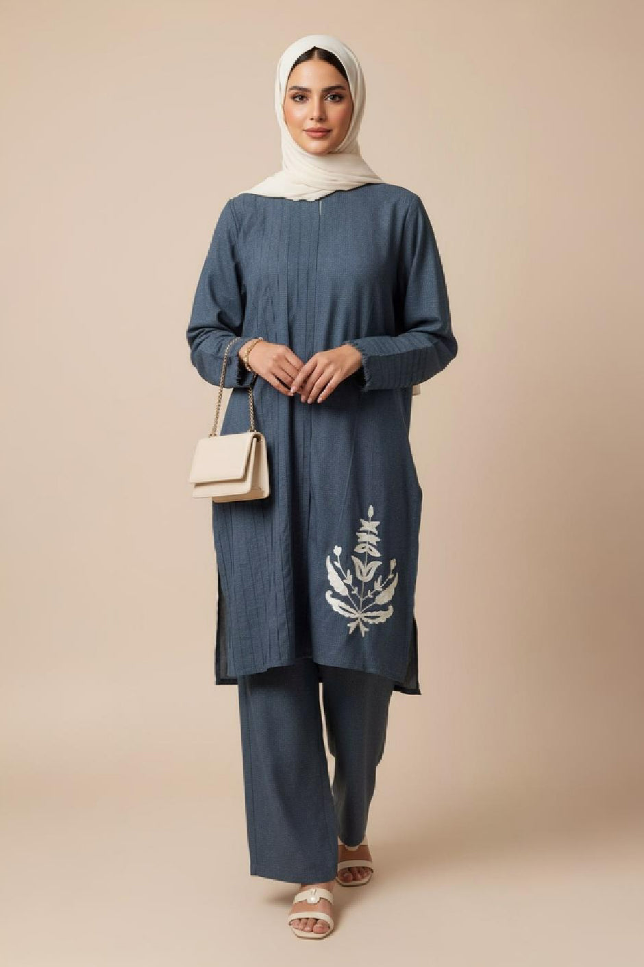 A refined two-piece set featuring a long, straight kurta with pintuck detailing on the left panel and a botanical embroidered motif on the right hem. Paired with matching straight-leg trousers for an effortlessly polished, modest look—perfect from day to dinner.