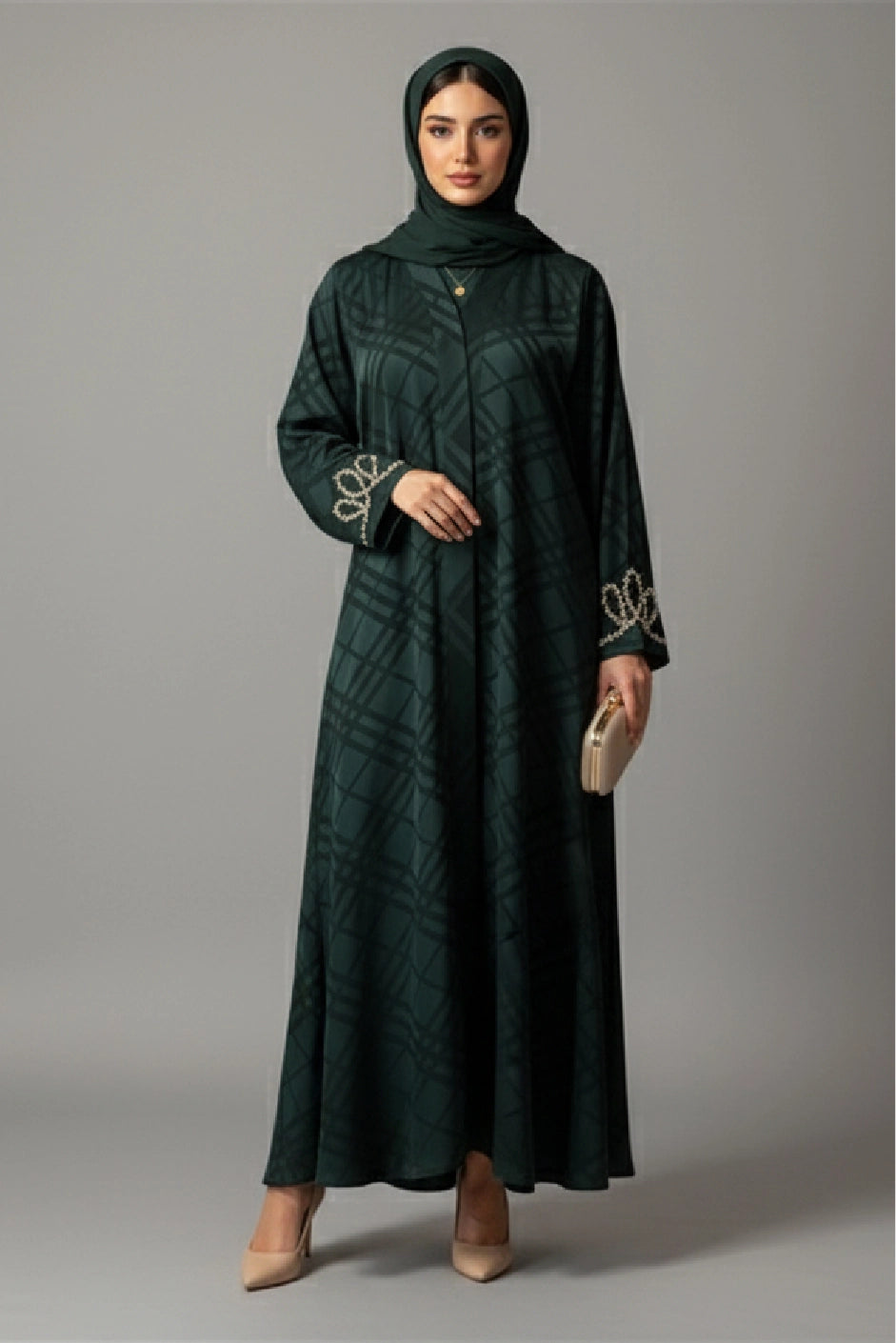 A refined front-open abaya in deep emerald green, cut from self-textured Korean silk with a subtle lattice (self-jacquard) pattern. Finished with graceful pearl loop embroidery at the cuffs for a soft, dressy sparkle—perfect from day to occasion.