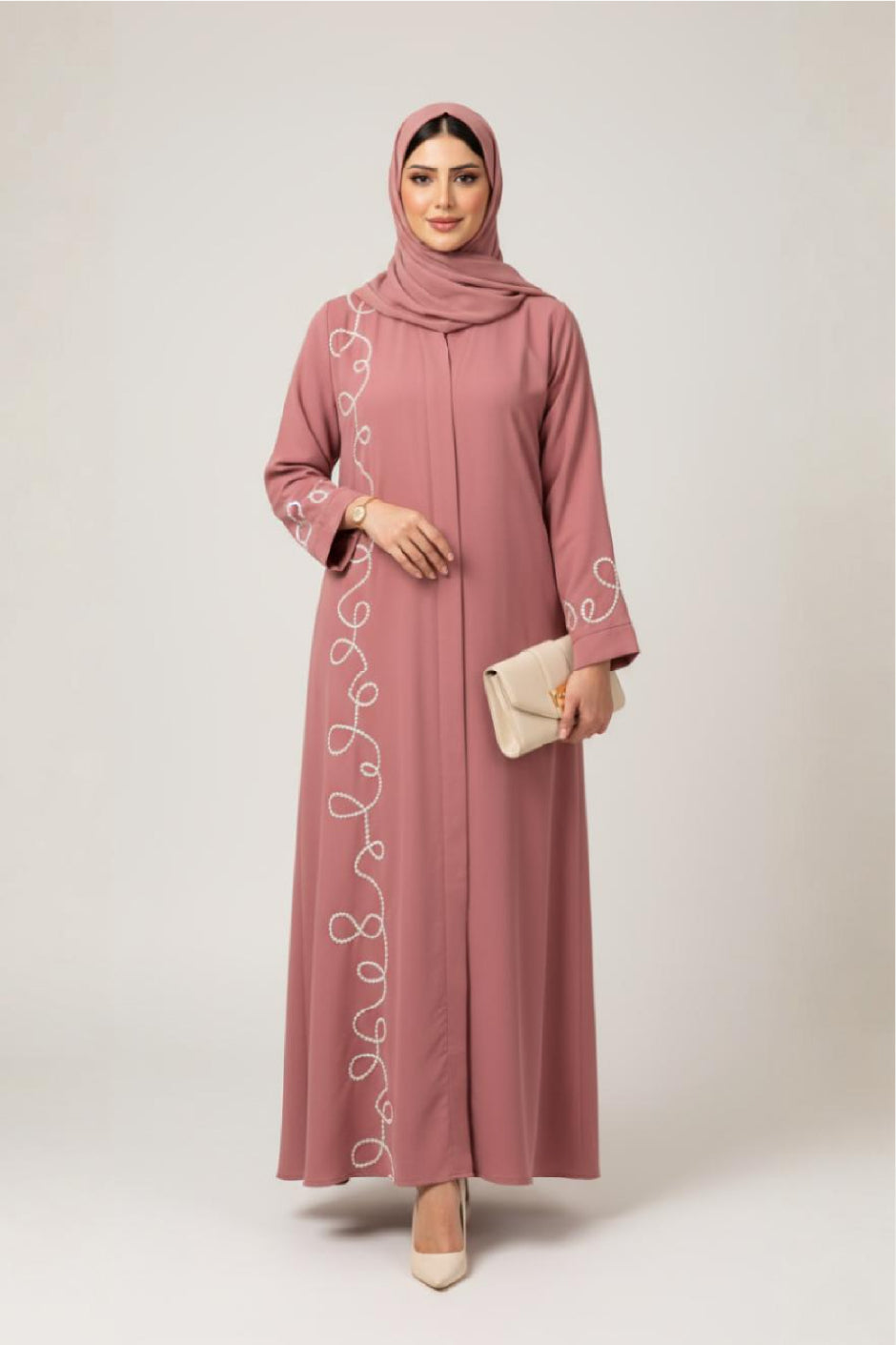 A refined dusty-rose abaya with a clean front and fluid, full-length drape. A single looped embroidery trail in ivory runs from shoulder to hem on one side, with matching motifs on the cuffs—elegant, modern, and eye-catching without being loud. Opaque, breathable fabric keeps it comfortable all day.